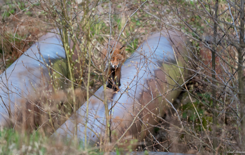Kevät saapui vihdoinkin ja aurinko paistoi useana päivänä peräkkäin. Aamunkävelylläni näin ketun tulevan pois lintualtailta. Odotin sen kävelevän sillan yli, mutta ei. Se tuli puron yli kaukolämmönputkea pitkin. Risujen läpi ehdin saada vain yhden kuvan.