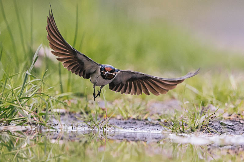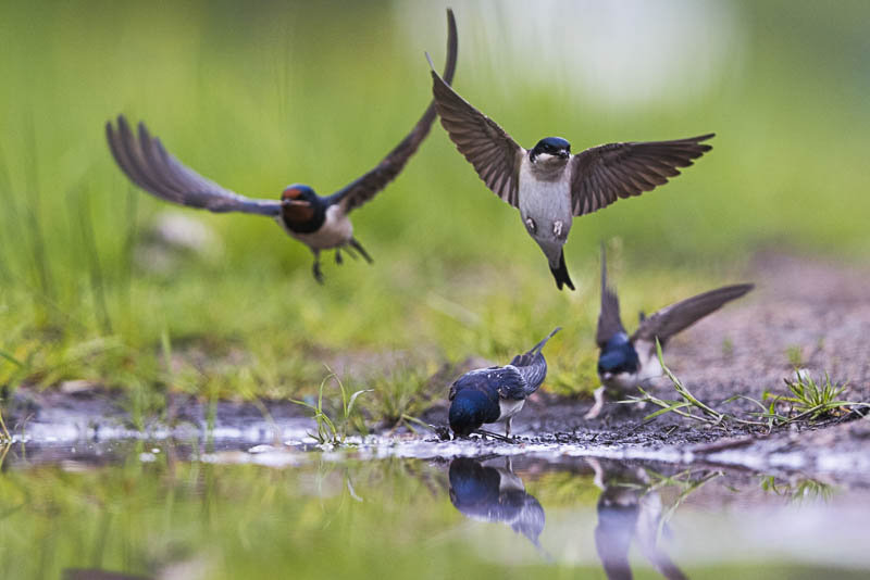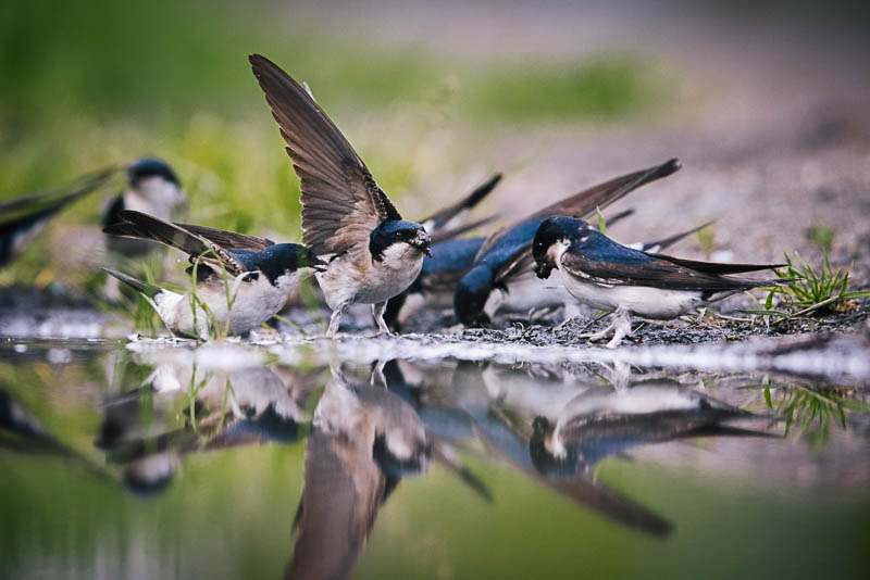 Räystäs- ja haarapääskyillä on vasta pesänrakennus käynnissä, kun lätäköstä haetaan sopivaa materiaalia. Nujakoiltakaan ei voinut välttyä, mutta materiaalia varmaan riitti kaikille. Osa linnuista kävi juomassa ja osa tyytyi pyydystymään hyönteisiä alueella. Väripilkkuna lätäköllä kävi tikli sekä yksivärisenä mustarastas.
