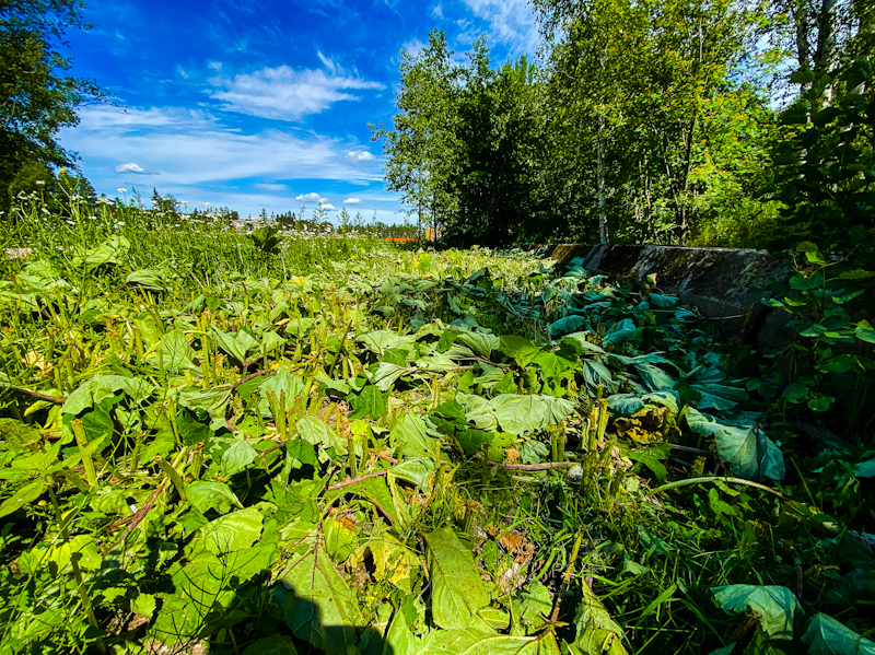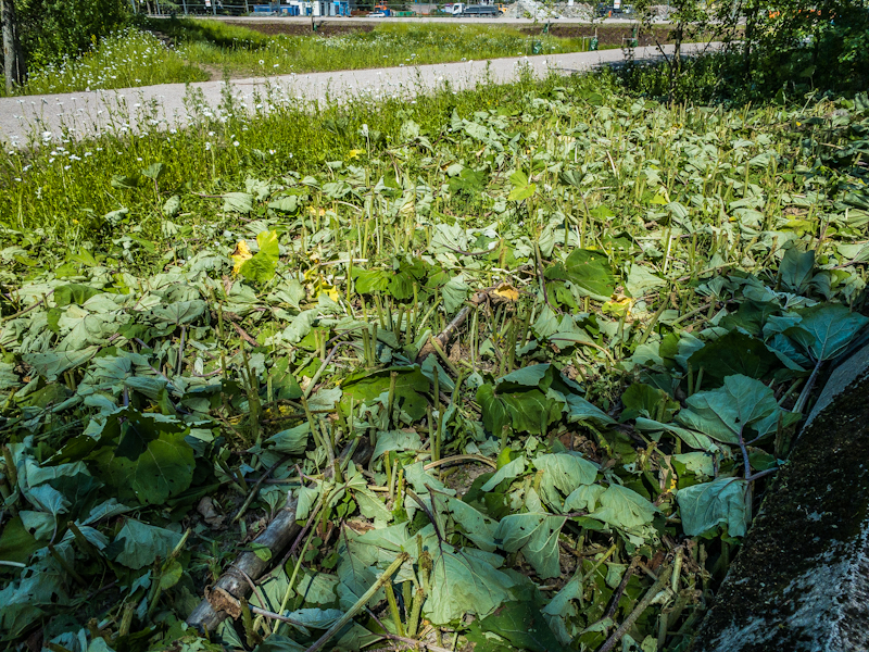 Kesäkuun puolessa välissä oli etelänruttojuuret niitetty. Jälki oli sen verran systemaattinen ja työkalumainen, että tuskin niitä oli revitty. Leikatut kasvit oli kuitenkin jätetty maahan. Näin ollen illakoiden esiintulo, mitä aprikoin edellisessä viikkoraportissa, jäi näkemättä. Hämmästyttävää oli kuitenkin se, että ruttojuuret tekivät uudet lehdet ja ne olivat esillä jo juhannuksen jälkeisellä viikolla. Ruttojuurten viereen on ilmaantunut päiväkakkaroita (siis ei saunioita eikä saunakukkia). Vaikuttavat istutetuille. Kuulin tuttavaltani, että kaupunki on istuttanut päivänkakkaroita koristeeksi muuallekin.