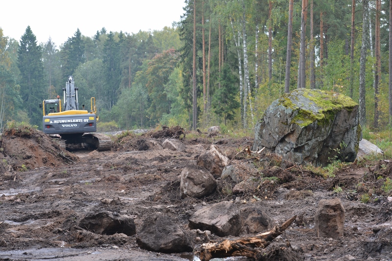 Kävelytietä, joka on hakkuuaukion ja Plantagen välillä, levennetään reilusti. Miksi? Taitaa olla pohjusta kadulle, joka rakennetaan Plantage edestä tulevalle Suomenlahdentielle. Työmaalla on siirtolohkare joka on haljennut.Tämä ei kuitenakaan ole se suojeltu suuri lohkare, joka 20m hakkuuaukiosta pohjoiseen ja on rauhoitettu luonnonmuistomerkkinä. Sen koko on noin 6 x 6 x 4m. Lohkareen alla on pienehköjä luolia. Siirtolohkare on ajautunut paikalleen 12.000 vuotta sitten Viipurin alueelta. Jääkaudella oli voimaa.