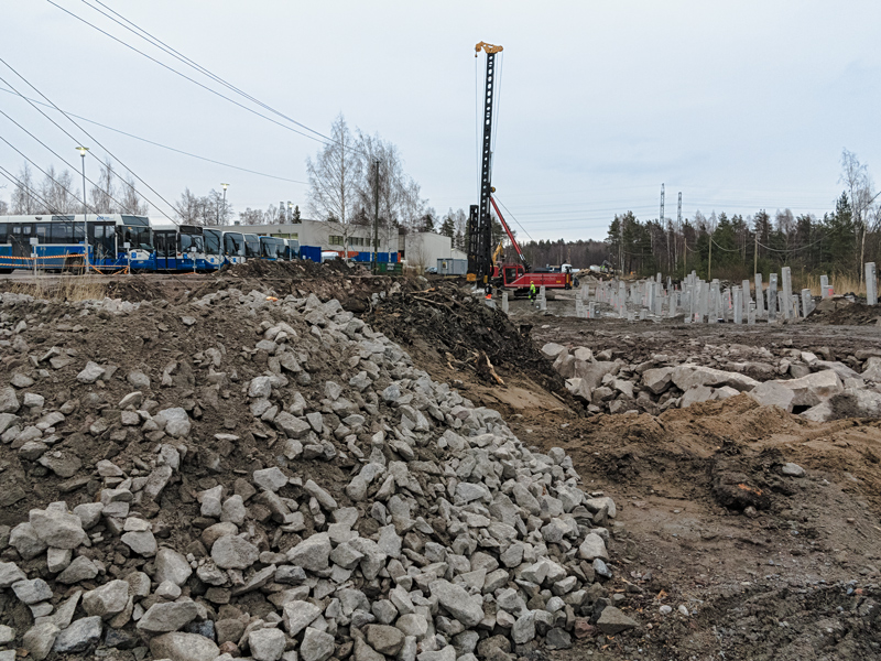 - Varikon edessä on paalutus edelleen käynnissä – Kuva: Tommi Heinonen