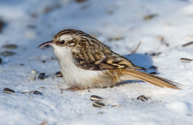 Kuten aikaisempina talvina niin myös tänä talvena lumikko on tullut etsimään syötävää ruokinnan läheisyydestä. Pienenä ja hoikkana se pystyy saalistamaan hiiriä ja myyriä niiden käytävistä. Joskus voi huono-onninen lintukin jäädä saaliiksi. Lumikko (mustela nivalis) on Euroopan pienin näätäeläin. Isommasta kärpästä lajin erottaa talvella täysvalkeasta hännästä (kärpällä hännän pää on musta).