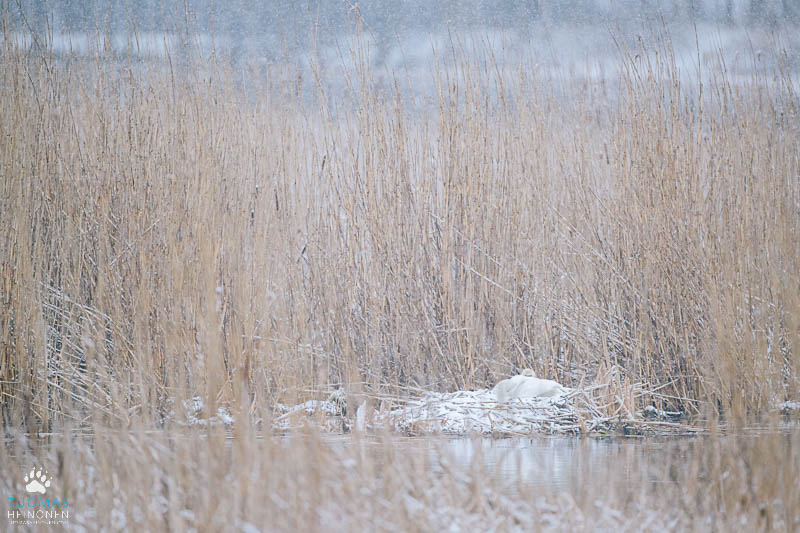 - Kyhmyjoutsen pesällä – kuva Tuomas Heinonen