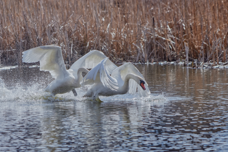 Heti kun pääsin töyräältä alas, ilmaantui laulujoutsenpari trumpetit törähdellen. Laskeutuivat ja toinen hyökkäsi välittömästi lähelläni olleen kyhmyjoutsenen kimppuun, ajoi sen ruovikkoon ja alkoi nokkia sitä. Tuli takaisin altaalle, mutta kyhmy jäi ruovikkoon eikä tullut takaisin sen tunnin aikana, jonka olin altaan reunalla, eikä edes nostanut päätään näkyville. Menehtyikö tai loukkaantuiko?