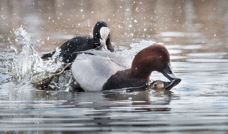 - Nokikana käy punasotka-lemmenparin kimppuun – Kuva Esa Mälkönen