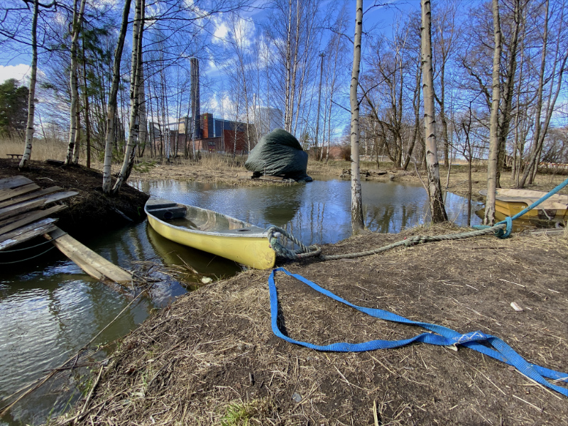 Puron suisto on kummallisen näköinen: veneitä, kanootteja, lasten potkupyöriä, telttamaisia pressukyhäelmiä, lautajätettä… Ja tallitien metsässä on monet kasvit, mm. japaninruttojuuret suojattu huomionauhoin 😉 Lisäksi ihmetyttää kuka käy katkomassa tallitien metsässä puita. Sehän kuuluu altaan suoja-alueeseen.”