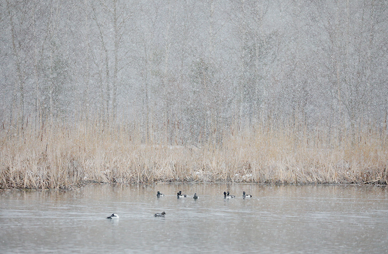 - Silkkiuikut lumisateessa merellä – kuva Paul Stevens