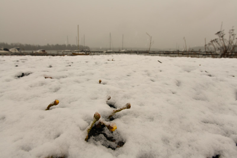 ”Talvi tuli vähän myöhässä, kun huhtikuussa satoi enemmän lunta kuin kaikissa talvikuissa! Torstaiaamuna maa oli Nuottalahdessa valkoinen, ja silkkiuikut riiustivat lumisateessa.