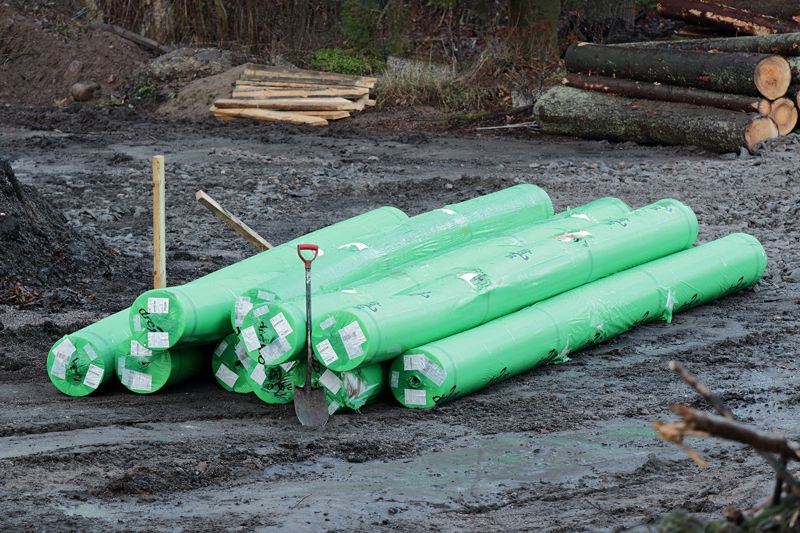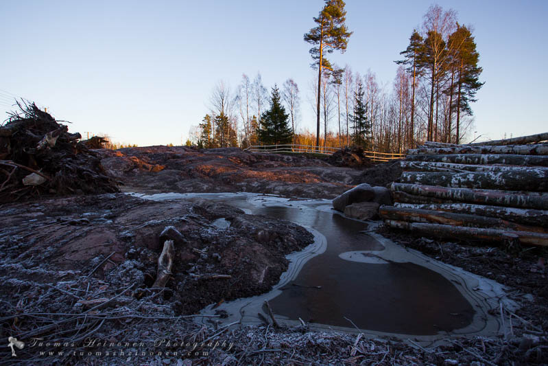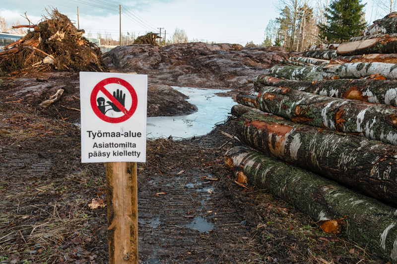 Tiistilässä kerättiin kantoja edelleen ja puita kuljetettiin pois. Näkyviä infotauluja ja kieltoja ilmaantui työmaa-alueille.