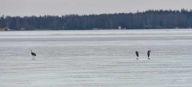 Voi olla, että takatalvesta ei pitäisi puhua maaliskuussa. Pakkaset ja lumi kuuluvat vielä maaliskuuhun. Mutta siltä vain tuntui kuluneella viikolla, kun Finnoonpuro sai jääpeitteen uudelleen sitten helmikuun alun, puron suu alkoi jäätymään ja jääraja siirtyi Pirisaaren tasolle, tulvaniitylle muodostui uudestaan kantava jääpeite, muutto pysähtyi ja puron suun päivystävät linnut siirtyivät ulommaksi avoveteen , ruttojuuret kituuttivat … . Kuitenkin jäällä saattoi parhaimmillaan nähdä 12 harmaahaikaraa.