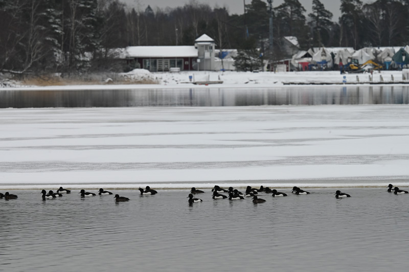 Keskiviikon lumipyryssä kanadanhanhipari uiskenteli purossa, sinisorsan koiras yritti sietää märkää lunta, ja pajusirkut saapuivat massoittain. Puron rannoilla liikkui ainakin 20 pajusirkkua. Merellä en nähnyt kovin pitkälle, vain telkkäparin ja isokoskelon, jotka tulivat riittävän lähelle laiturin päätä, tallentuivat muistikortille.
