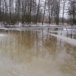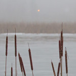 Lauantaina iltapäivällä kaikki muuttui ja sunnuntaina vesisateen jäljiltä lumi oli huvennut. Purossa ja ojissa oli paljon vettä, kävelytiet ja polut muuttuivat liukkaiksi, ruokintapiakka oli lumeton. Sunnuntain sumussa aurinko oli kuin kuu tai kuin verikuu.