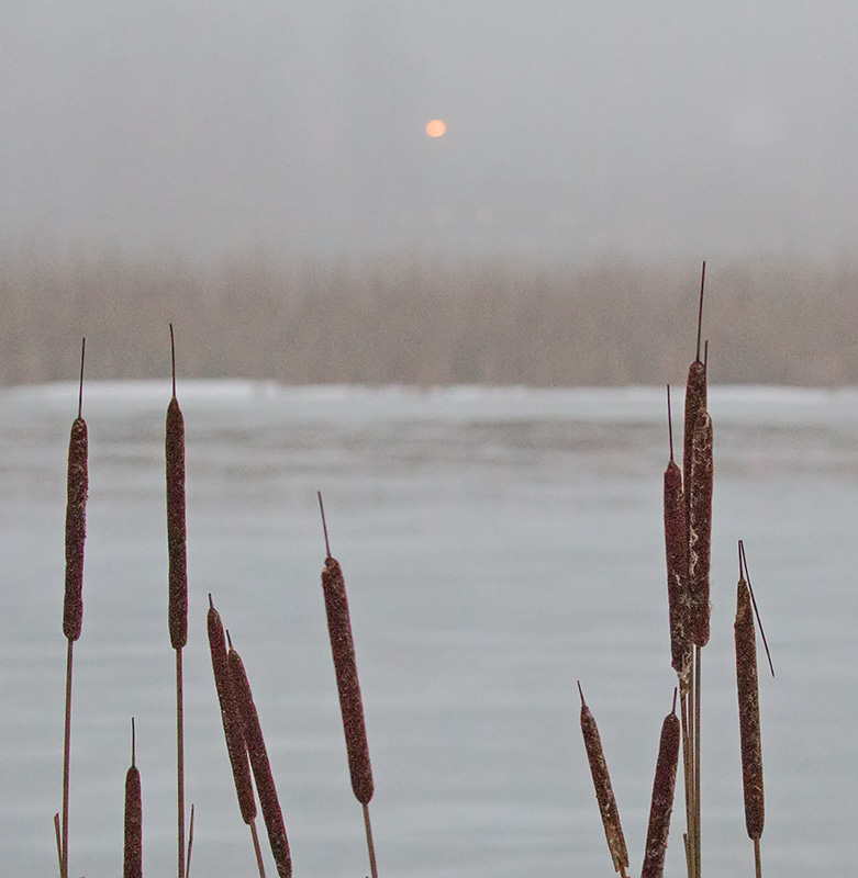 Lauantaina iltapäivällä kaikki muuttui ja sunnuntaina vesisateen jäljiltä lumi oli huvennut. Purossa ja ojissa oli paljon vettä, kävelytiet ja polut muuttuivat liukkaiksi, ruokintapiakka oli lumeton. Sunnuntain sumussa aurinko oli kuin kuu tai kuin verikuu.