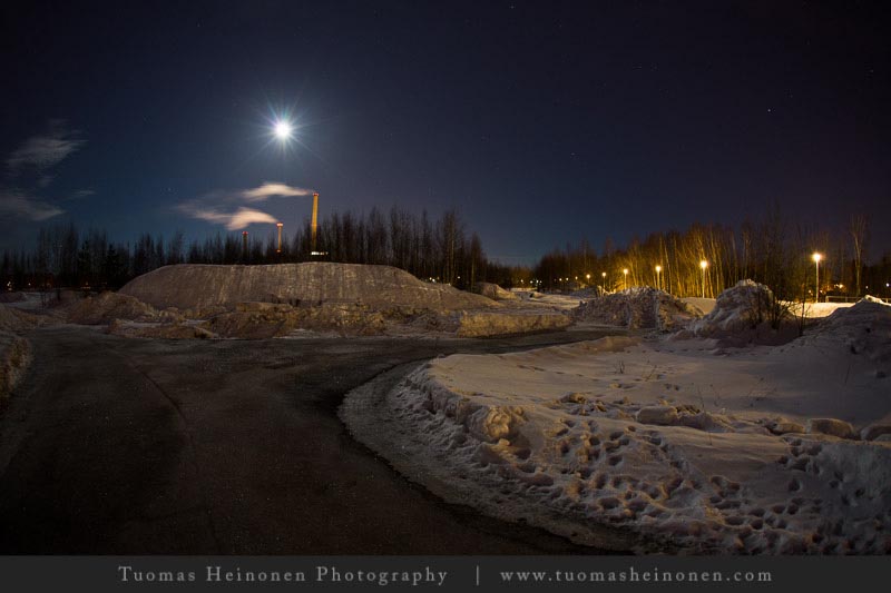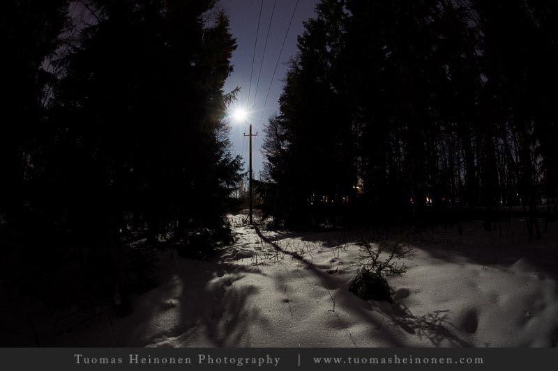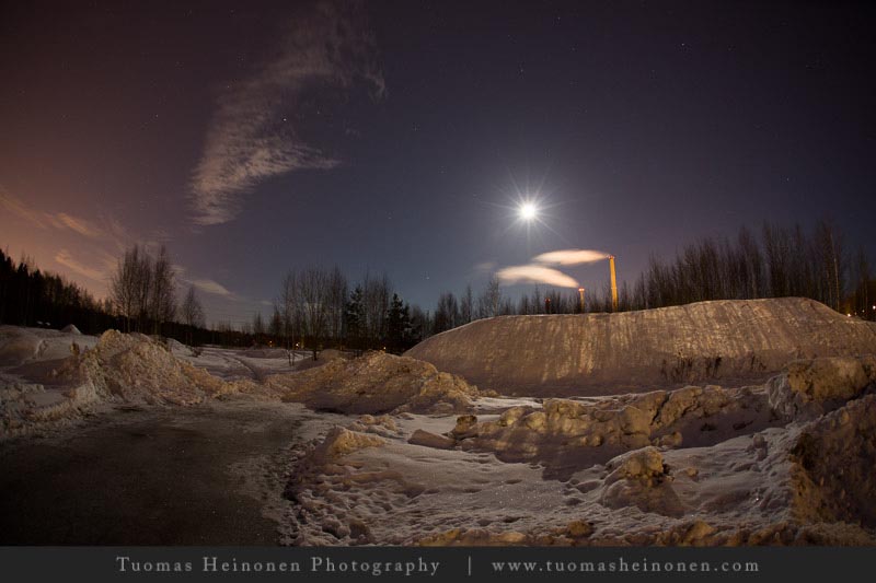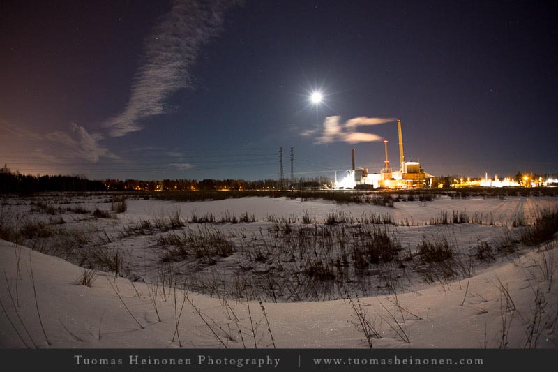 Suomenojaa ja sen ympäristöä olemme jo tämän talven aikana kuvanneet auringonnousun, auringonlaskun aikaan ja keskipäivän auringon loisteessa. Mikä puuttuu? No tietysti yökuvaus täydenkuun aikaan. Tuomas korjasi puutteen ja niinpä viikon kuvista löytyy täydenkuun valaisema Suomenoja.