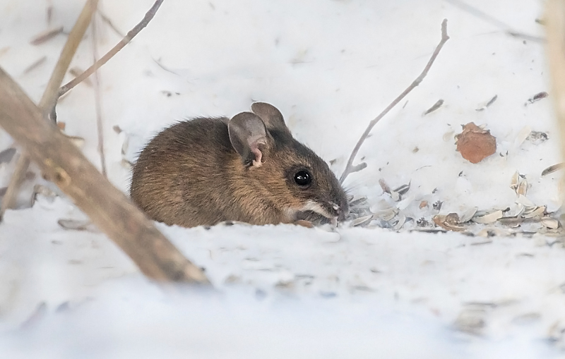 Ruokintapaikalla on normaalisti metsämyyriä, joskin tänä talvena hyvin vähän. Sunnuntaina paikalla oli metsähiiri, joka eroaa metsämyyrästä mm. suurempien paljaiden korvien, pitkän hännän ja pitkulaisen kuonon myötä.