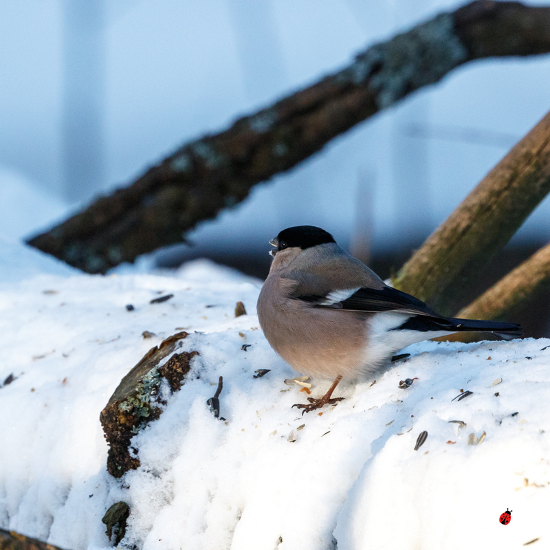Silloin tällöin ruokintapaikalla nähty harvinainen talvehtija punarinta on onnistunut selviytymään nyt lumisenakin aikana. Tälle hyönteissyöjälle kelpaavat hienoimmat ruokintapaikan murut. Suuri haaste on edessä, jos yöpakkaset alkavalla viikolla painuvat ennustettuun alle 20 asteeseen.