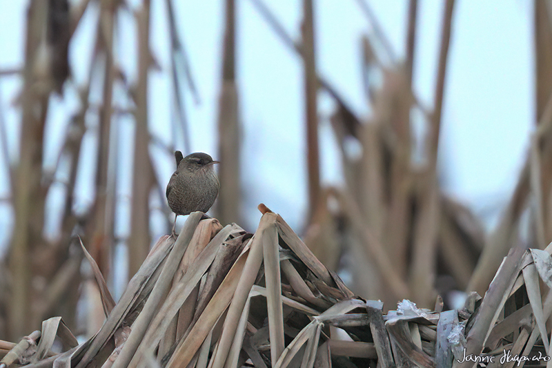 Tammikuu oli aika erikoinen. Melkein kaikenlaisia sääilmiöitä ja sateita on koettu. Lämpötilakin vaihteli kovista pakkasista lämpöasteisiin. Parina päivänä oli sakeaa sumua ja pakkasta. Lämpöasteissa sumu muodostaa kasvien pinnoille vesihelmiä mutta pakkasessa kasvien pinnoille muodostui piikin näköisiä jääkiteitä. Ruokintapaikalla ruokailijoiden määrä on kasvanut. Ajoittain mustarastaita ja punatulkkuja on runsaasti ja luonnollisesti myös tiaisia. Ruokaakin on jo kulunut lähes 70 kiloa. Jakson yllätysvieraina olivat nuori kyhmyjoutsen, peukaloinen ja nokkavarpunen.