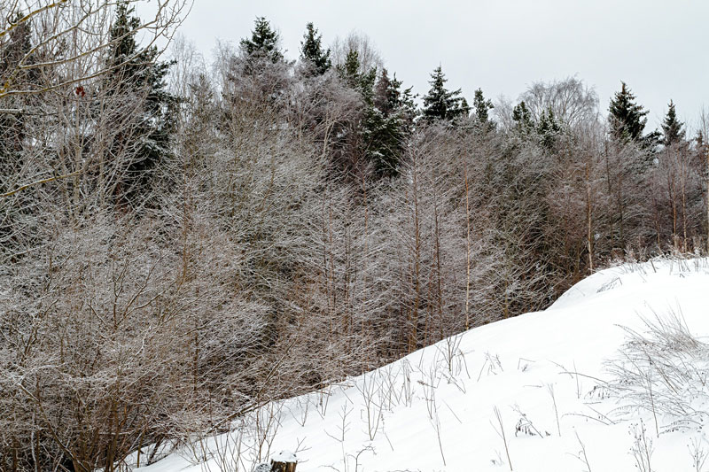Viikko alkoi suojasäällä, harmaana, sateisena. Muutamana päivänä satoi silkkaa vettä. Sitten pakasti, polut tulivat jäisiksi, kevyesti satanut lumi kuorrutti maiseman kauniiksi.