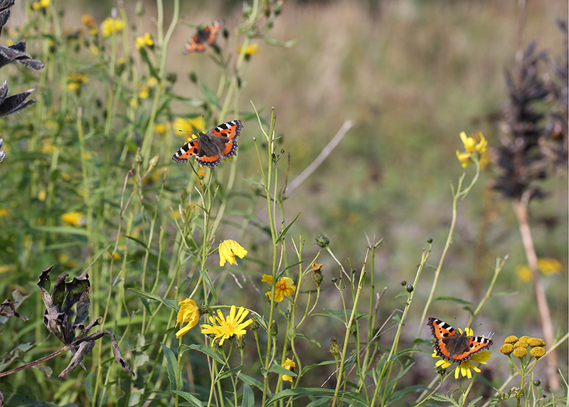 ” Perhosniityllä lentelee tällä hetkellä varsinkin nokkosperhosia. Toki niiden joukossa voi havaita myös aina silloin tällöin myös ohdake- ja neitoperhosia sekä amiraaleja.