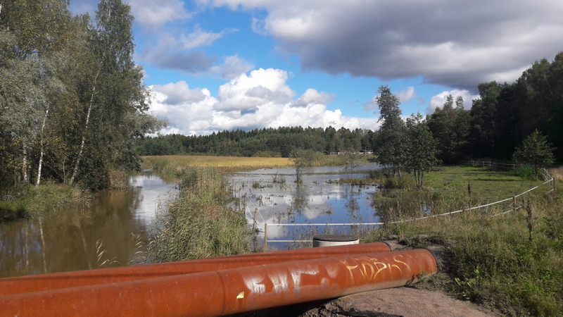 Lauantaina hevoset laiduntivat tulvaniityllä. Tänään sunnuntaina tilanne oli toinen. Illan sateen jälkeen Finnoonpuro on tulvinut yli äyräiden parissa paikassa jo keskijuoksulla. Mm. Finnoontieltä Olariin johtava Puolarintie on suljettu – aukeaa vasta maanataina. Niinpä tulvaniitty oli veden peittämä sunnuntaina. Espoossa satoi lauantai-illan aikana noin 61mm eli noin kuukauden normaali sademäärä.