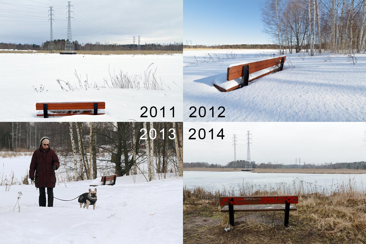Otsikkokuva näyttää helmikuun lopun lumitilanteen eteläisen lintutornin vieressä olevan penkin kohdalla vuosina 2011-2014. Kuvakoostetta katsellessa pitää muistaa, kuten YLE:n Matti Huutonen huomautti, että kolme edellistä talvea ovat olleet poikkeuksellisen lumisia pääkaupunkiseudulla. Vertailu on kuitenkin kiinnostava ja kertoo tästä vuodesta aika paljon.